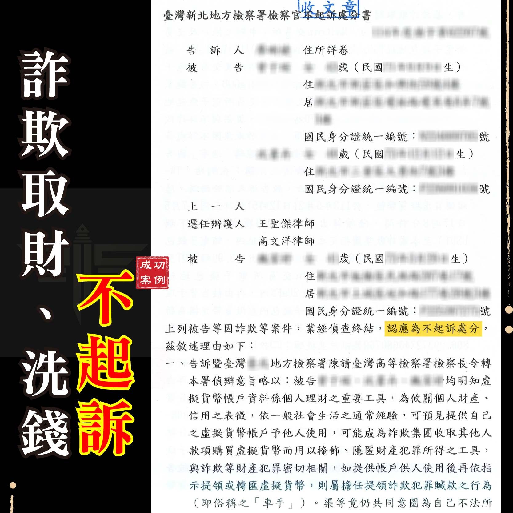 經過謙聖律師團隊縝密的辯護與不懈的努力,新北地方檢察署的檢察官最終完全採納了我們的法律意見。檢察官在不起訴處分書中明確指出,本案查無其他積極證據,足以認定A先生等人有詐欺或洗錢的犯意,因此對他們做出了「不起訴處分」。這份不起訴處分書,對A先生等人而言,不僅僅是免除了牢獄之災,更是洗刷了他們被冤枉的罪名,還給了他們清白與正常生活的權利。這也再次證明,即使面對再複雜的金融犯罪指控,只要能找到專業的律師,從法律的核心爭點切入,就有機會扭轉乾坤。
