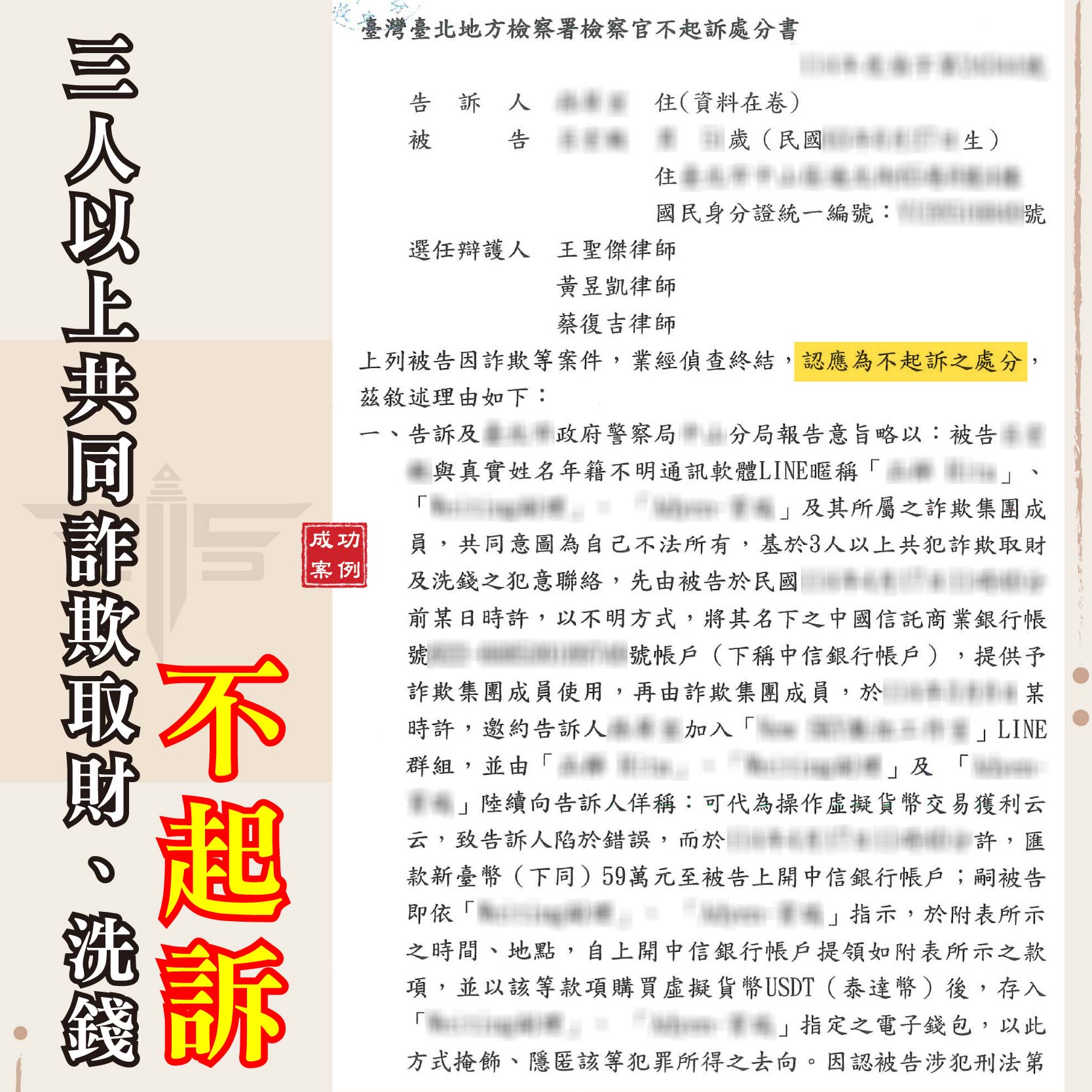 經過謙聖律師團隊條理分明、證據充分的辯護,檢察官最終全面採納了我們的法律主張。檢察官在不起訴處分書中明確指出,A先生確實是基於求職及投資獲利的誤信而操作金流,且在察覺異常後主動報案、積極配合調查,足證其確係遭詐騙集團利用,而非共同參與不法之人。