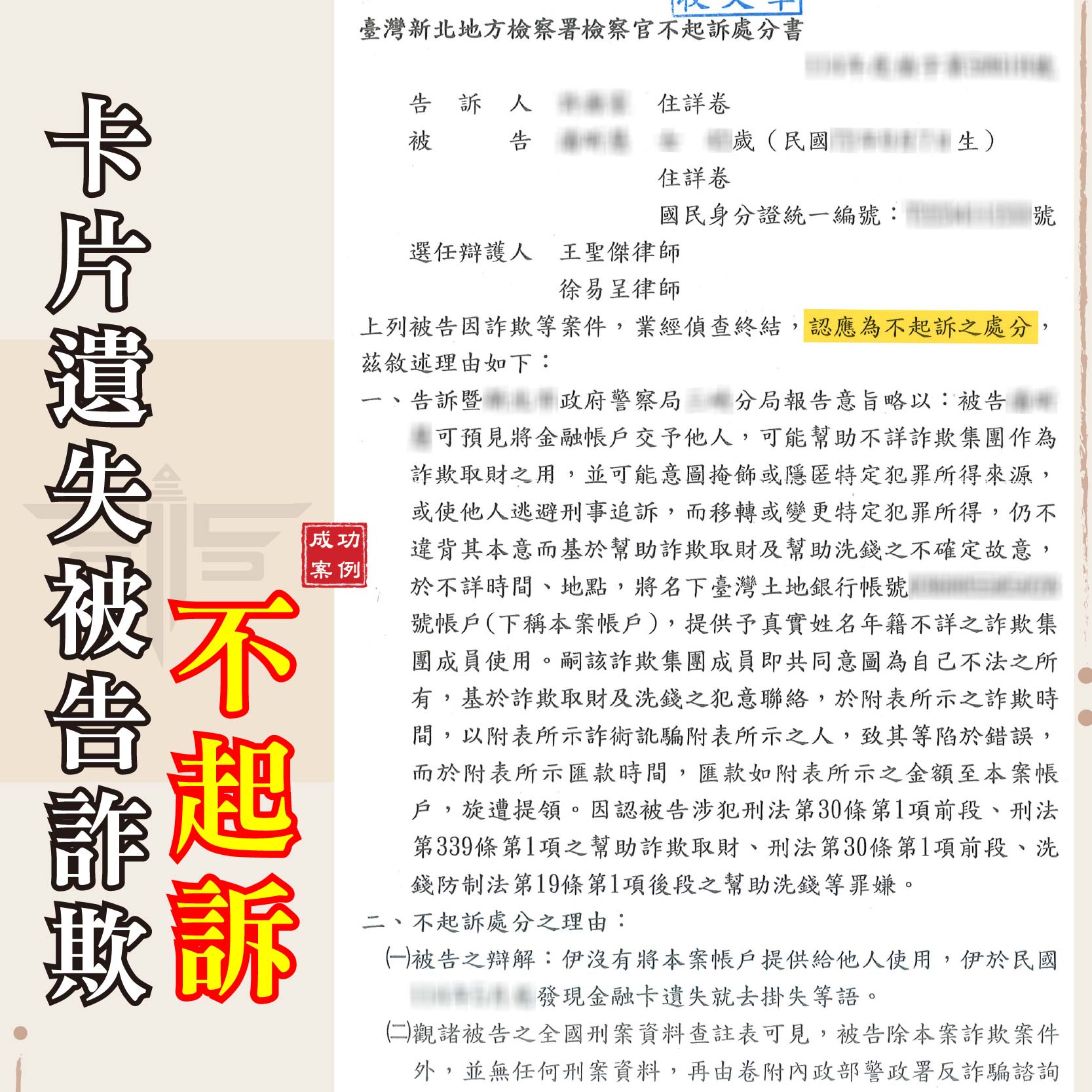 ➙最終,檢察官依據《刑事訴訟法》第252條第10款規定,認定本案犯罪嫌疑不足,給予A小姐「不起訴處分」。這個案件的成功,不僅還給了A小姐一個清白,也再次證明了謙聖國際法律事務所的堅持與專業。即使是實務上認為「最難打」、「沒救」的提款卡遺失案件,只要有專業律師的協助,仔細梳理證據、精準切入法律爭點,依然有機會逆轉勝!