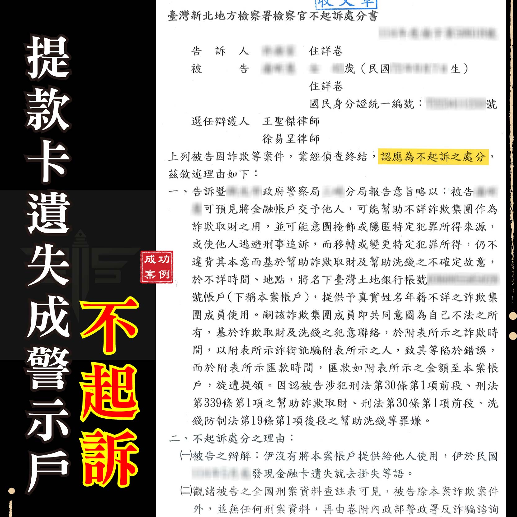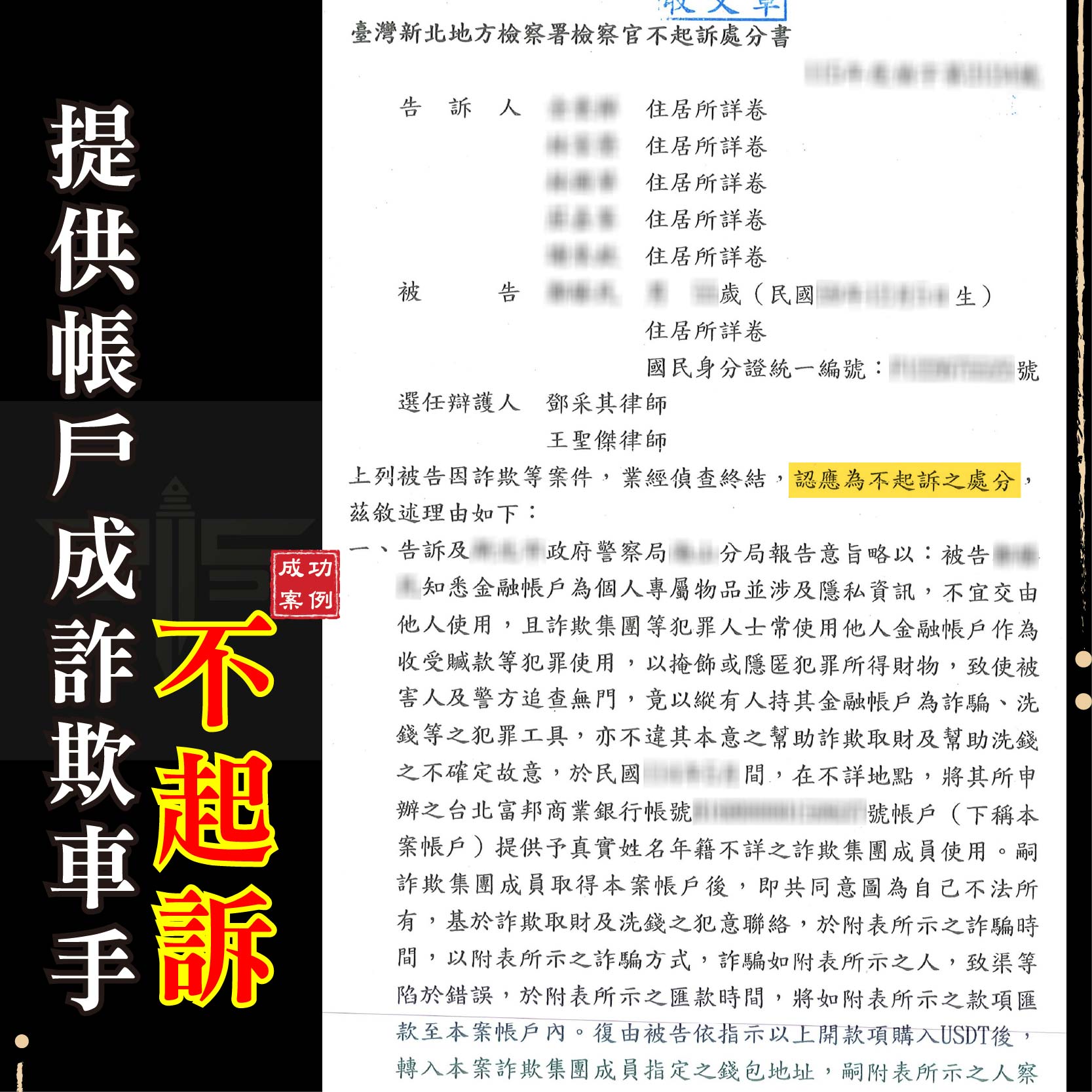 提供帳戶竟遭控涉嫌車手(新北地檢 1150330)
