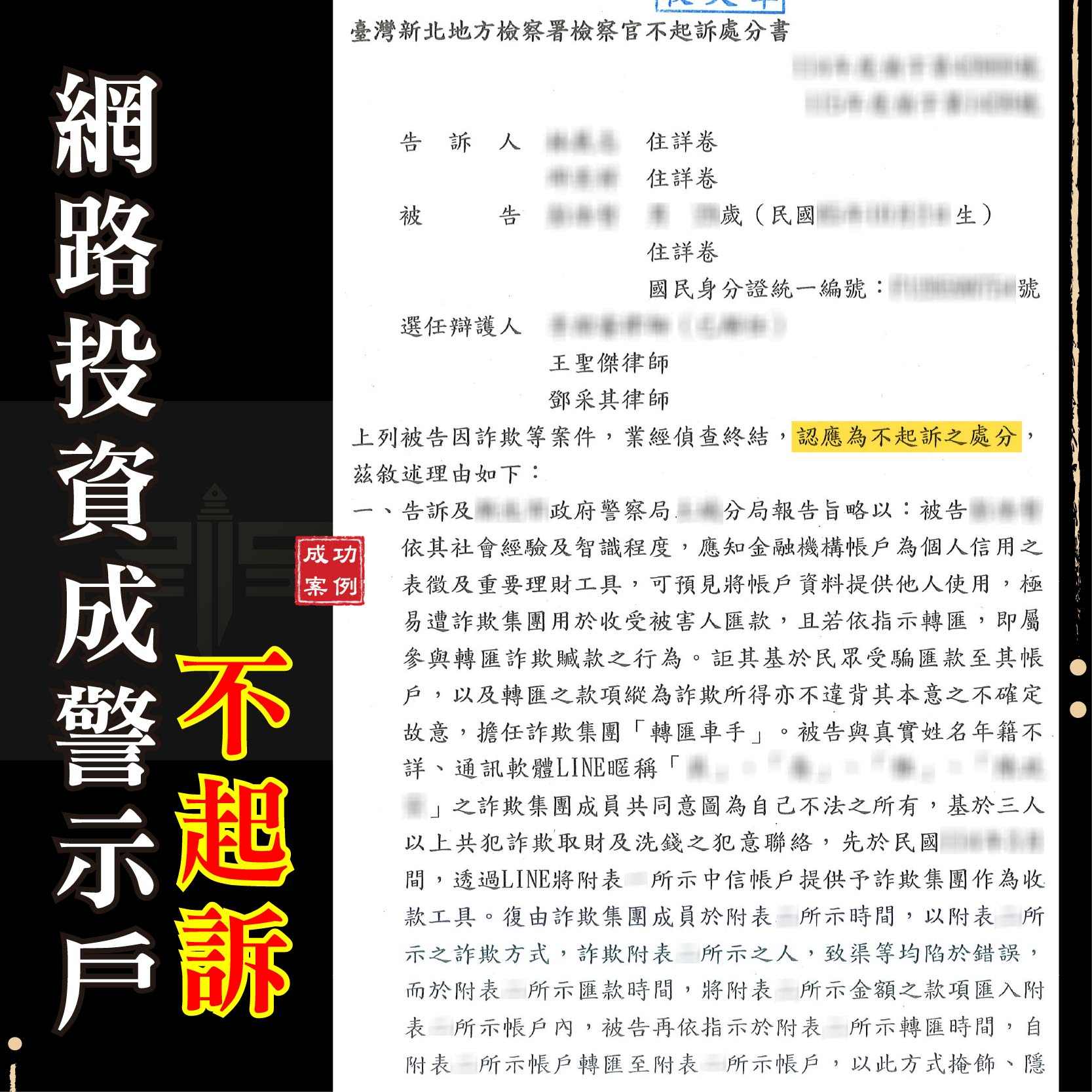 網路投資遇詐成警示帳戶(新北地檢 1150326)
