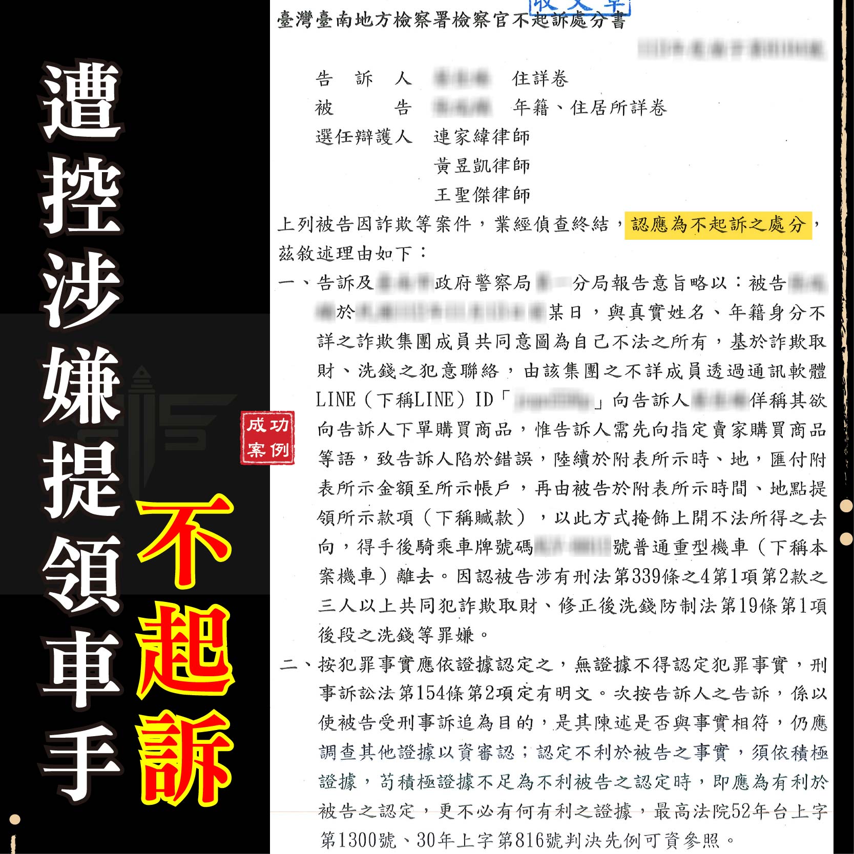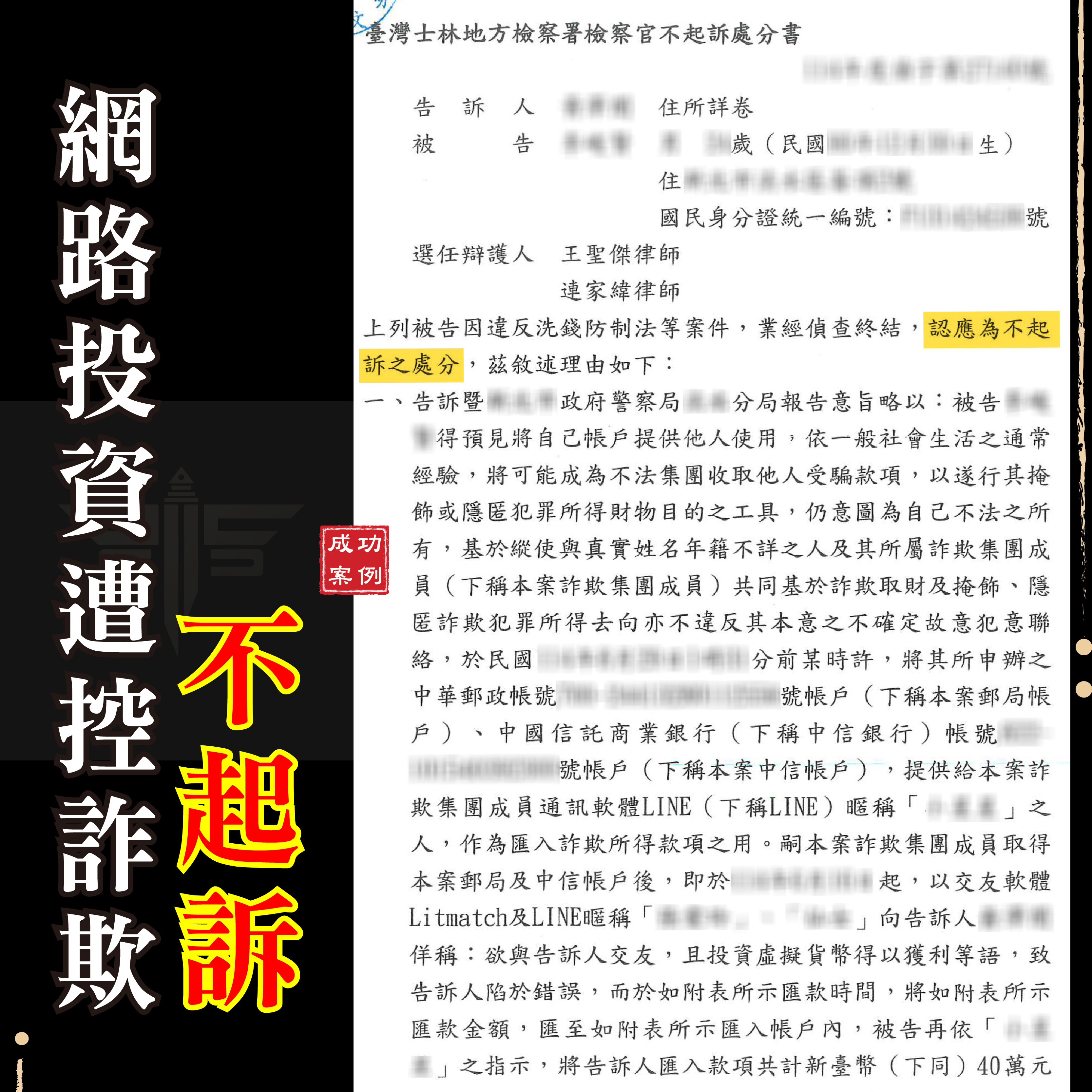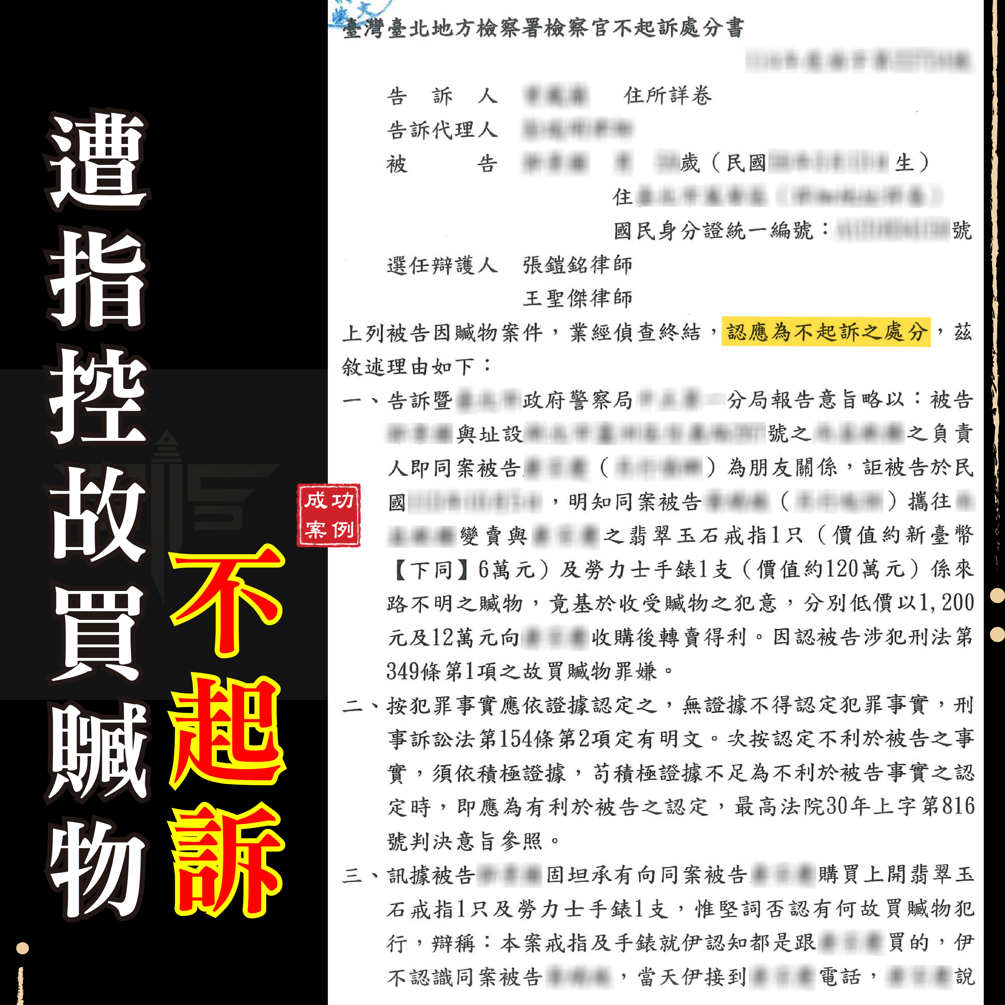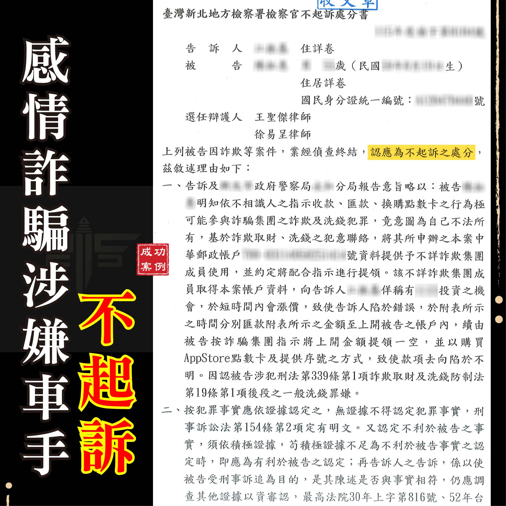 刑事案件不起訴成功案例: