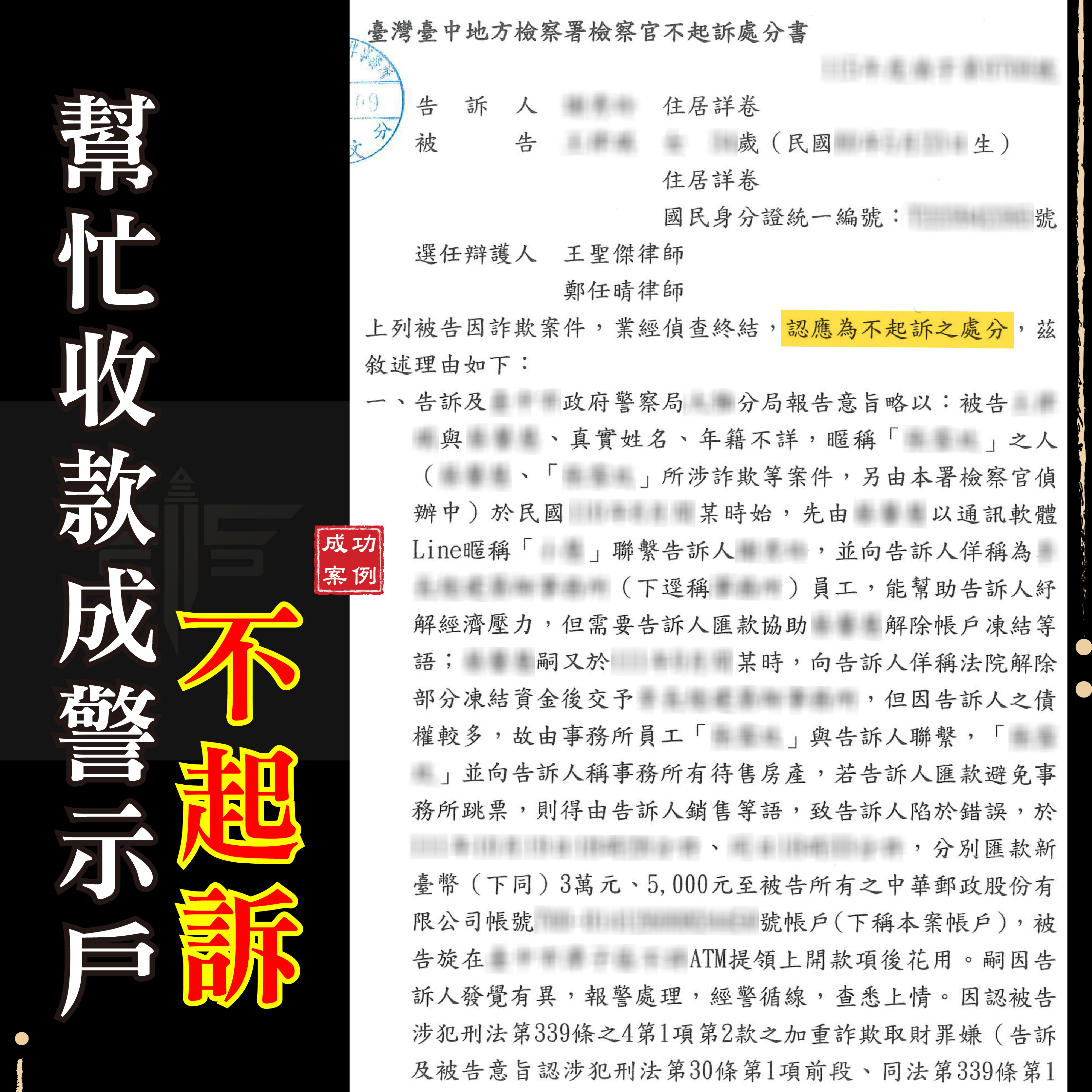 幫忙收款項竟成警示戶(臺中地檢 1150409)