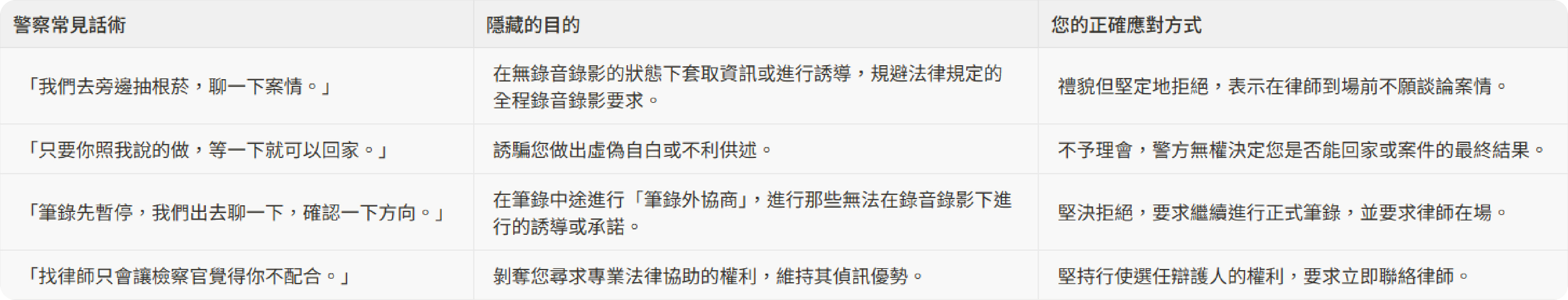 當警察在筆錄外向您說「認罪就能緩刑」或「配合就不會羈押」時,請記住: