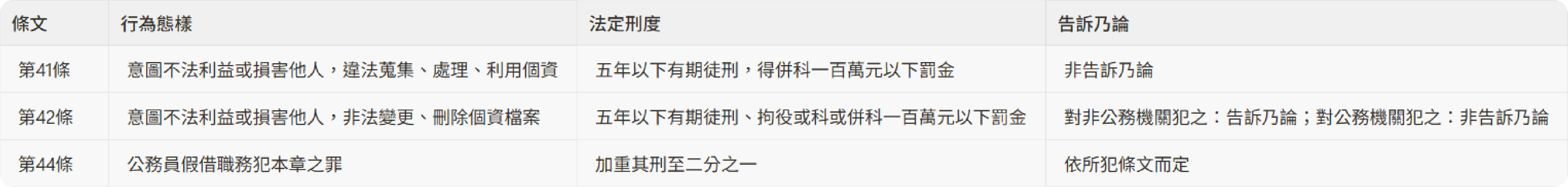 個資法刑事責任的法定刑度與告訴條件,可整理如下表供讀者參考:
